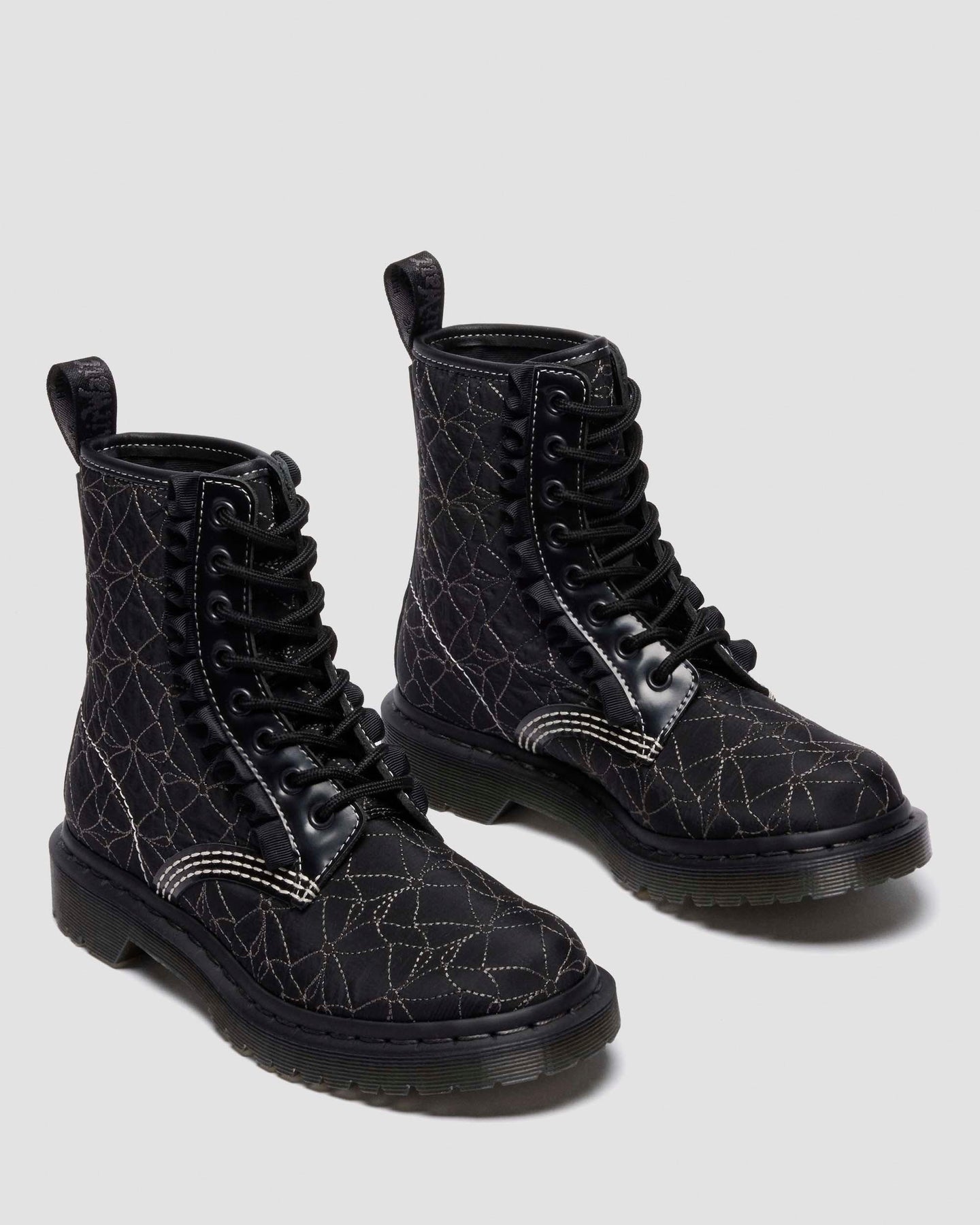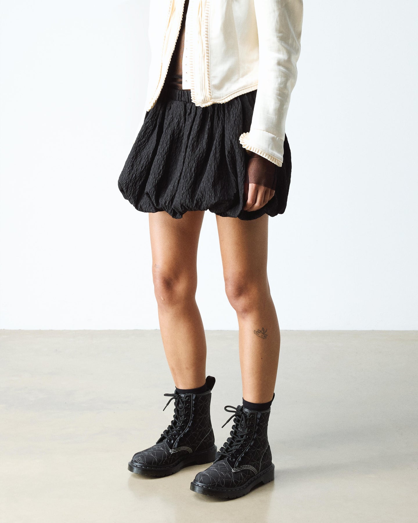 All frills. A decorative takeover on a classic. The 1460 Frill 8-eye boot sees the original DM’s silhouette embellished with bows and frills. Crafted in Buttero, a soft leather with a satin gloss and supple feel. We stitched intricate bows and contour lines across the upper in contrasting white while weaving black frills behind the eyelets and laces. The boot is accented with a gunmetal and black heel loop, white welt stitching and a black DMS sole with classic grooving.