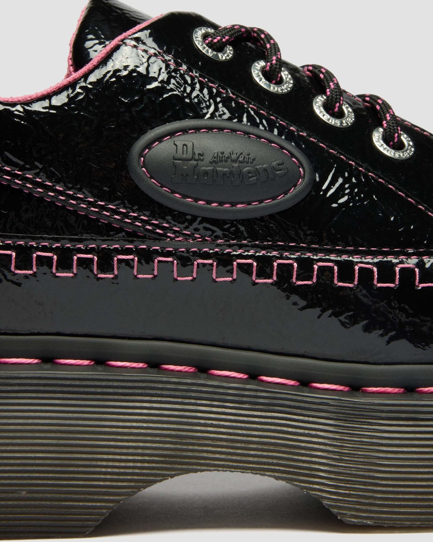 Make some noise with Buzz. The 5-eye shoe isn’t here to blend in. Decked out in black distressed patent leather with black-and-pink cord laces, silver hardware, and playful pink stitching from welt to eyelets, it’s a wink-and-nod to 90s attitude. Stand tall on the chunky barrel-edge Buzz sole, with DM’s signature grooving and a secret leaf pattern underfoot.