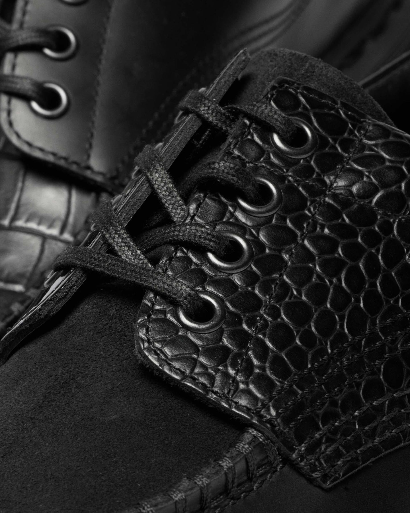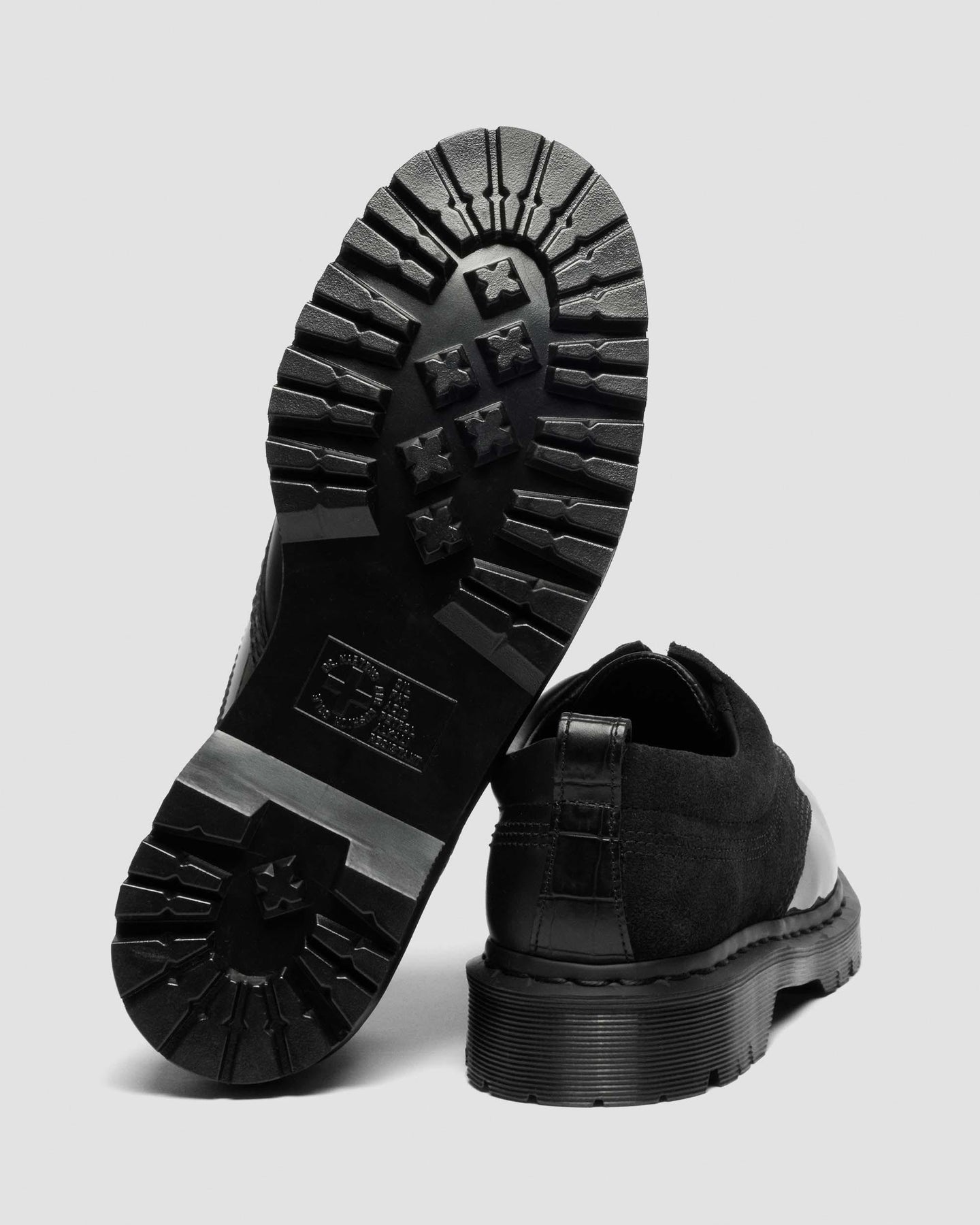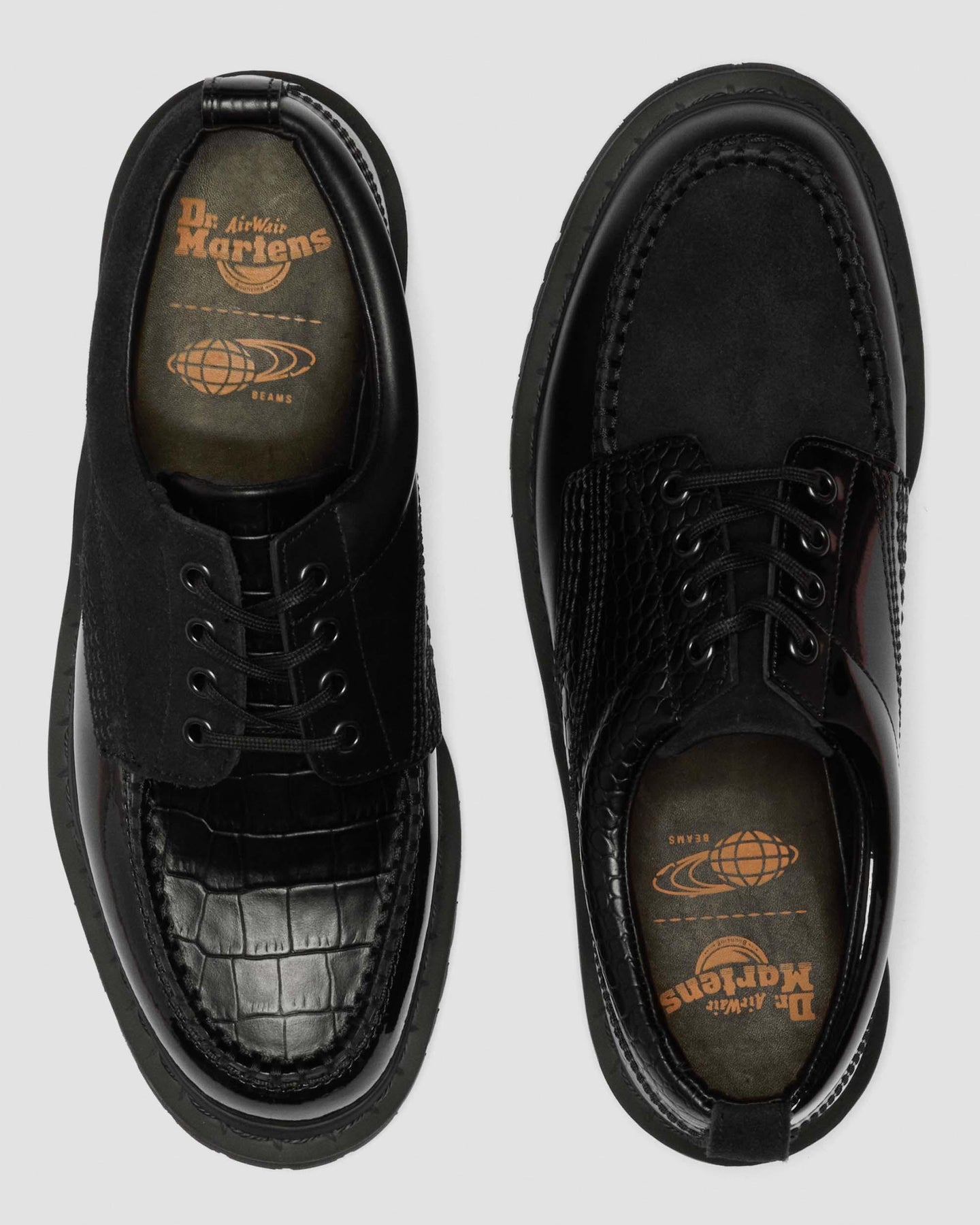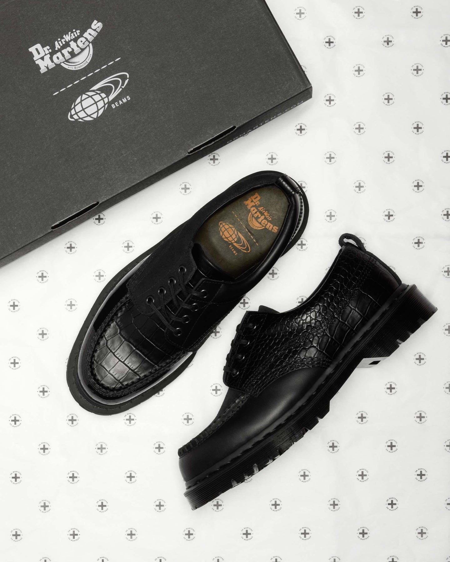 Our workwear inspired Lowell shoe in union with the giants of contemporary Japanese fashion, BEAMS. Expertly crafted with a BEAMS’ “crazy pattern” design using with a mixed material construction across the 4-eye moc toe shoe. Featuring a contrast of classic Orleans, high-shine Patent, soft Bronx Suede, and textured Croc Emboss Atlas leathers all in versatile black. Set on a chunky BEN sole with exaggerated tread and fixed with a black-on-black Goodyear welt stitch.