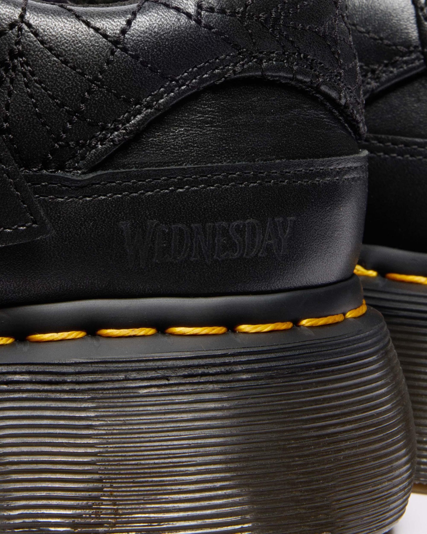 Not your average Mary Jane. This limited-edition silhouette from the DM’s x Wednesday collection takes a gothic classic and gives it a twisted edge. Crafted from a tactile mix of Nappa and Lux leather, the shoe is embroidered with stained-glass-inspired detailing - a nod to the dorm room windows at Nevermore Academy. The heel is debossed with the Wednesday logo, while the custom buckle design reflects the sharp, distinctive aesthetic of the series. Finished with our classic yellow welt stitching and set on an exaggerated, empowering sole.